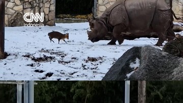 Seekor rusa muntjac atau rusa China terlihat beradu dengan seekor badak India di sebuah kebun binatang di Kota Wrocław, Polandia. Rusa muntjac yang memiliki berat 17 kilogram bernama Muntjac Dad tersebut melawan Marusia, badak India seberat 1,8 ton.